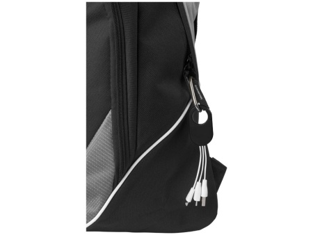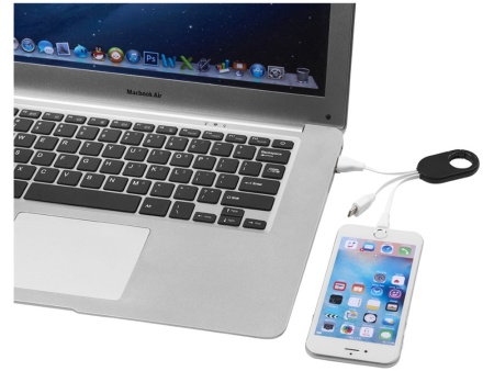 Кабель для зарядки 3-в-1. Кабель для зарядки Troop 3-в-1 с коннектором USB Type C и двойным совместимым коннектором 2-в-1 для устройств Apple® iOS и Android. Кабель оснащен карабином для удобного крепления к сумке. АБС-пластик.