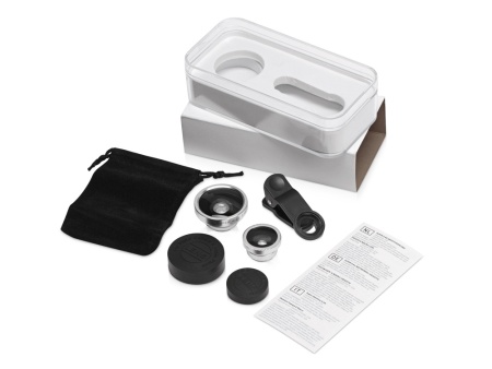 Универсальный набор из 3 линз (объективов) для смартфона. Подходит как для внешних, так и для камер селфи. В наборе: широкоугольный объектив (0,4 х), объектив рыбий глаз (180°) разбирается на 2 части, одна из них - объектив для макросъёмки, зажим-прищепка для крепления объективов, инструкция, пластиковый бокс, защитные крышки для объективов, мягкий чехол.