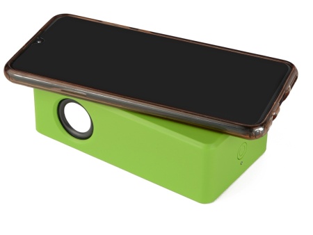 Колонка Vigo Vibration. Просто положите свой мобильный телефон на ровную поверхность и слушайте усиленный звук из встроенной колонки. Легкая в использовании. Не требуются настройки беспроводной сети или кабели. Требуются 3 батарейки размера AA (не включены в комплект). АБС-пластик с мягким на ощупь покрытием.