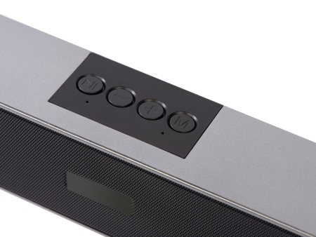 Портативная стереоколонка имеет два динамика по 3 Вт каждый, которые стереофонически распределяют звук. Саундбар воспроизводит музыку с USB-флешки и с SD-карты, а также по Bluetooth.
