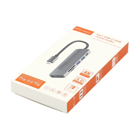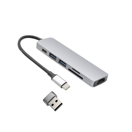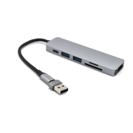 Концентратор Sixto 6 в 1 позволяет расширить возможности Вашего компьтера, ноутбука или рабочего стола. Подключение осуществляется при помощи надежного кабеля Type-C, что позволяет синхронизировать работу подключить компьютера, ноутбука или планшета. Порт №1 - слот для чтения накопителей памяти TF. Порт №2 - слот для чтения накопителей памяти SD. Порт №3 - стандартный адаптер, который поддерживает чтение накопителей памяти версии USB 2.0 или подключение дополнительных устройств (передача данных до 480 Мбит/с). Можно подключать кабель USB для зарядки смартфона. Порт №4 - высокопроизводительный порт версии USB 3.0 для подключения периферийных устройств: флешка, внешний жесткий диск, картридер, клавиатура, мышь, др. адаптер / хаб, web-камера, принтер, сканер, МФУ и т.п((передача данных до 5Гбит/с). Порт №5 - стандартный адаптер Type-C для подключения дополнительных устройств. Порт №6 - HDMI конвертер, который поддерживает передачи видео и изображений на телефон, телевизор или компьютер.