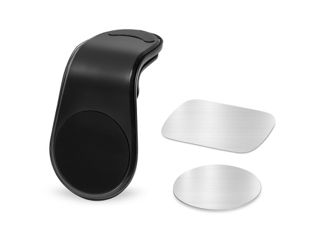 Магнитный держатель для телефона крепится к вентиляционной решетке автомобиля при помощи прищепки, которая снабжена прорезиненными вставками для плотного сцепления с поверхностью. Также в комплекте идут 2 самоклеящиеся стальные пластины. Они крепятся к смартфону.