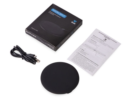 Moon spot — беспроводное устройство для зарядки в бархатистом корпусе софт-тач от Evolt. При гравировке верхний слой снимается, открывая подсветку — на бархатистом черном фоне светящиеся белым контуры выглядят особенно ярко и контрастно.