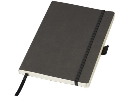 Блокнот Revello. Мягкий на ощупь, гибкий блокнот (размер А5 для ориентации) со встроенной эластичной застежкой, закладкой, петелькой для ручки и кармашка для документов на внутреннем форзаце сзади. 80 листов кремовой линованной бумаги (80г/м2). Упакован в черную коробку-рукав. Кожа ПУ.