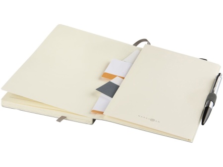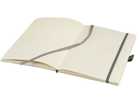 Блокнот Revello. Мягкий на ощупь, гибкий блокнот (размер А5 для ориентации) со встроенной эластичной застежкой, закладкой, петелькой для ручки и кармашка для документов на внутреннем форзаце сзади. 80 листов кремовой линованной бумаги (80г/м2). Упакован в черную коробку-рукав. Кожа ПУ.