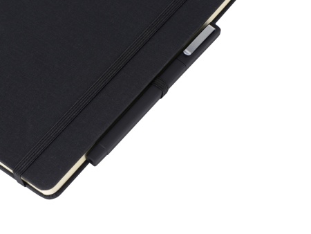 Лаконичный дизайн, приятная на ощупь твердая обложка имеет фактуру ткани. В блокноте 160 линованных страниц кремового цвета с плотностью 80 г/м2, петля для ручки, лента-закладка и удобный карман для карточек и записок.