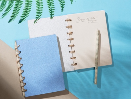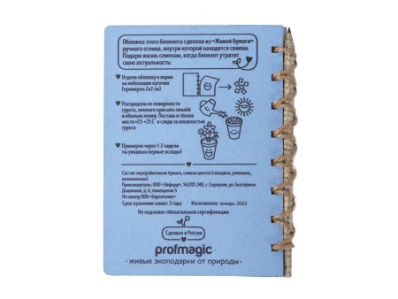 Живой Блокнот - это блокнот ручной работы с семенами гвоздики, ромашки и колокольчика внутри обложки. Блок на 50 листов сделан из экологичной неотбеленной бумаги, вместо пружины используется льняной шпагат. Блокнот поставляется с бумажным карандашом в наборе. После использования блокнота, вырвите обложку, порвите ее на кусочки и посадите в землю. Поливайте и уже через несколько недель вы увидите первые всходы.