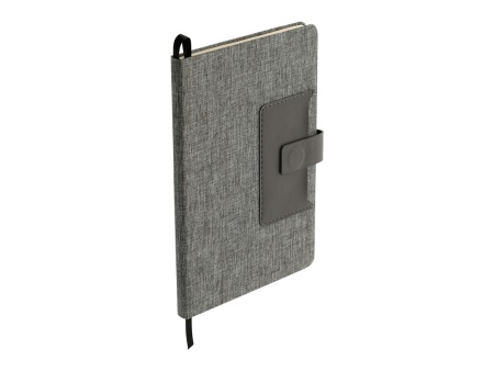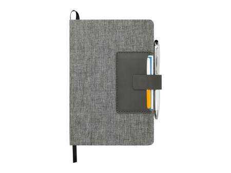 Стильный блокнот с твердой обложкой, обтянутой меланжевой тканью. Отделение для визиток из искусственной кожи и магнитным клапаном, под которым также можно закрепить свою любимую ручку.