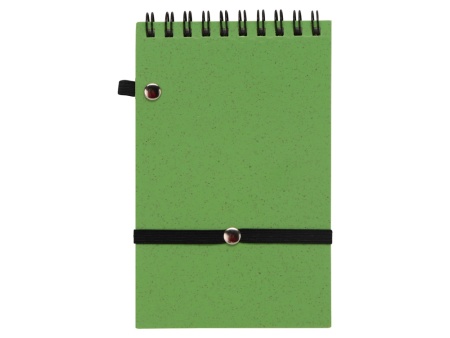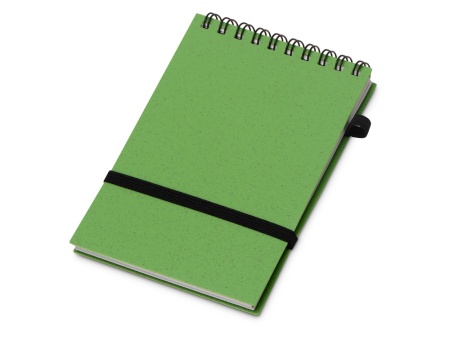 Блокнот с обложкой из переработанной пшеницы и пластика. Блок состоит из 60 листов переработанной бумаги белого цвета. Крепление - пружина. Дополнен петлей для ручки и горизонтальной резинкой.
