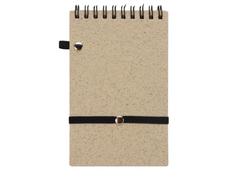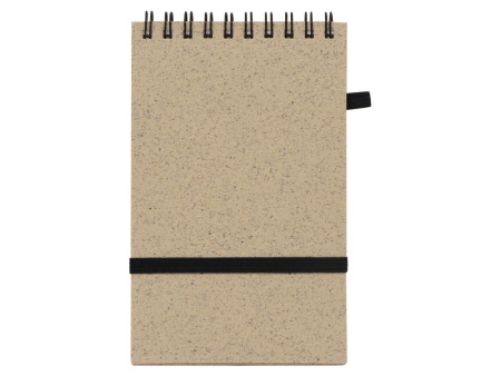Блокнот с обложкой из переработанной пшеницы и пластика. Блок состоит из 60 листов переработанной бумаги белого цвета. Крепление - пружина. В комплекте шариковая ручка из пшеничной соломы.