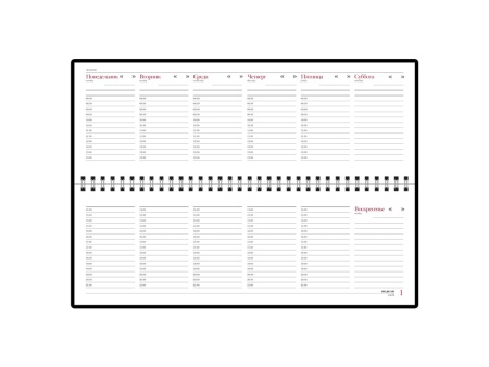 Недатированный планинг выпускается размером 305*130 мм и содержит 128 страниц (блок 292 х100 мм). Для них выбрана высококачественная белая бумага плотностью 70 грамм. Разворот представляет собой разметку на 7 дней недели с графами с указанием времени. Месяц и день недели указаны на русском и английском языках. Первые 15 страниц содержат справочные сведения из различных областей на русском языке. Крепление листов на открытом гребне способствует быстрому переходу по страницам.