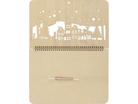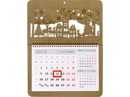 Настенный перекидной календарь имеет необычную обложку, в роли которой выступают фанерные крышки. Нижняя крышка сплошная, верхняя — резная, ажурная, с вырезанным новогодним пейзажем и большим полем под нанесение логотипа или надписи, которая органично впишется в облик календаря.