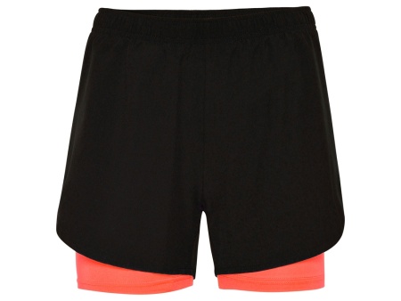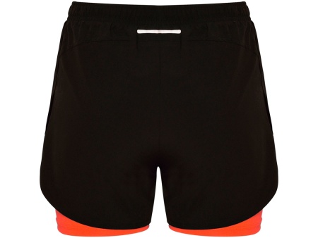 Женские спортивные шорты с контрастными внутренними короткими легинсами. Эластичный пояс с внутренним шнурком для регулировки. Светоотражающие детали. Специальная эластичная ткань для бега.