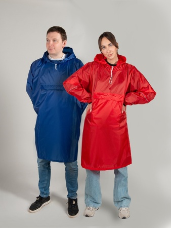 Дождевик - пончо прямого силуэта. Нагрудный карман плаща закрывается на молнию, которая дополнительно защищена клапаном, а еще в него можно полностью убрать дождевик. На дне кармана — ручка-петелька, которая в сложенном виде может использоваться для подвешивания.