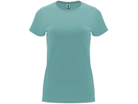 Женская приталенная футболка. Круглый вырез горловины обработан рибом 1х1. Шов горловины укреплен тесьмой.