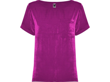 Женская футболка с коротким рукавом с расширенной горловиной. Накладной карман на груди слева. Спинка длиннее полочки. Разрезы в боковых швах.
