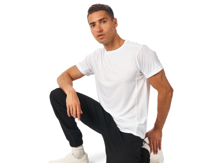 Мужская спортивная футболка выполнена из двух разных видов полотна: спинка и перед из интерлока имеют гладкую поверхность, а декоративные вставки выполнены из спортивной сетки ячеистой структуры. Благодаря наличию таких вставок воздух свободно проникает под футболку, охлаждая кожу во время спортивных нагрузок.