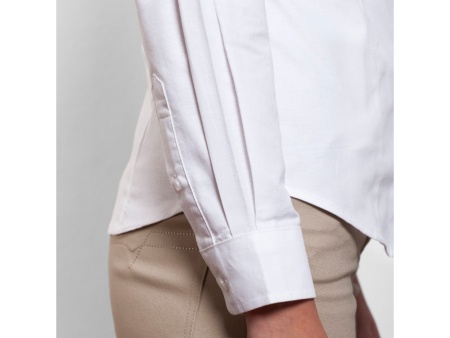 Женская рубашка с длинным рукавом, накладной карман слева. Планка на пуговицах. Отложной воротник на стойке продублирован пуговицами. Манжета регулируется по ширине с помощью 2-х пуговиц. Кокетка на спинке. Прилегающий силуэт.
