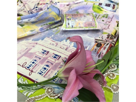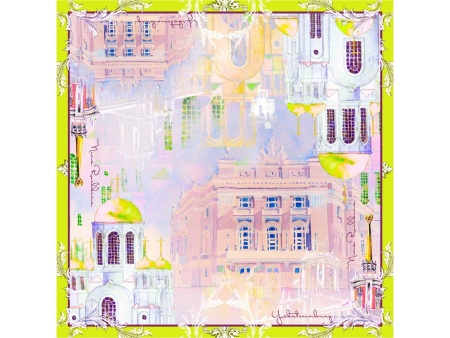 На платке изображены Храм-Памятник на Крови во имя Всех святых, в земле Российской просиявших, здание Администрации города Екатеринбурга, Екатеринбургский Государственный академический Театр Оперы и Балета.