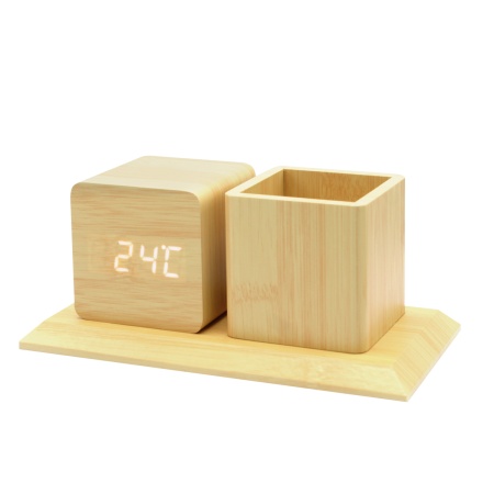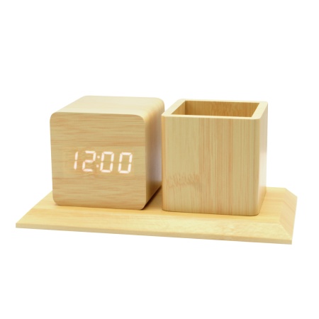 Многофункциональные деревянные часы с белой подсветкой и подставкой под канцелярские принадлежности. Функции: часы, дата, температура, 3 режима будильника, функция управления звуком (когда функция управления звуком активирована, дисплей гаснет через 15 секунд; вы можете активировать, дисплей хлопнув в ладоши, или слегка постучав по часам). В промежуток времени 18.00-7.00 яркость подстветски снижается на 50%. Источник питания: от сети, либо с использованием 3х батареек 3А (не входят в комплект). Поставляются вместе с русскоязычной инструкцией и USB кабелем для подключения к сети