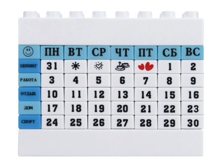 Замечательная и креативная идея для активных и целеустремленных людей. Вечный календарь в виде конструктора подчеркнет индивидуальность обладателя и поможет держать ритм жизни под контролем. Календарь поможет в планировании рабочего и свободного времени, ведь кубики можно собирать так, как вы того хотите, учитывая ваши планы и приоритеты.