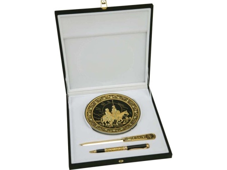 Набор: тарелочка для визитных карточек, нож для бумаги и шариковая ручка Дон Кихот и Санчо Панса. Дон Кихот в умах цивилизованного человечества всегда был символом беспримерного благородства и рыцарства. Именно поэтому мы обратились к мастерам испанского города Толедо с просьбой создать подарки на тему Дон Кихот. Сначала появились шахматы, которые были и остаются шедевром ювелирного искусства. Мы поблагодарили испанцев и включили в каталог шахматы, но чего-то нам не хватало. Шахматы для дома, – рассуждали мы, – но ведь о благородстве что-то должно напоминать и на работе. Поняли, - сказали мастера Толедо и создали офисный бизнес-набор Дон Кихот и Санчо Панса, который ничуть не уступает по уровню шахматам. Впрочем, судить, конечно, Вам.