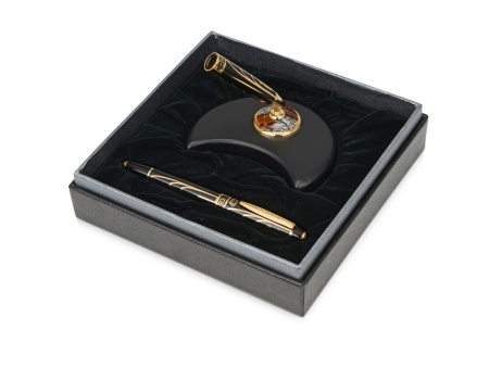 Отличный подарок для успешных мужчин или женщин. Набор включает в себя подставку с держателем и ручку-роллер. Выполненный в строгом стиле, набор прекрасно впишется в интерьер рабочего кабинета.