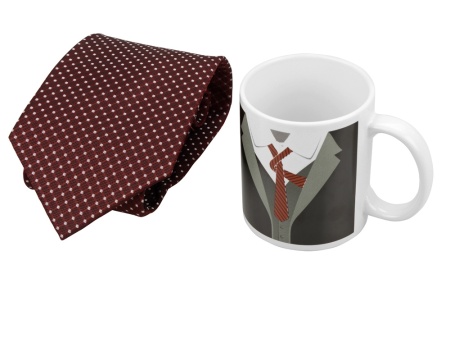 Оригинальный подарок не оставит равнодушным ни одного мужчину. В набор входит симпатичная кружка, украшенная изображением фрака с галстуком, а также настоящий галстук из качественного полиэстера.