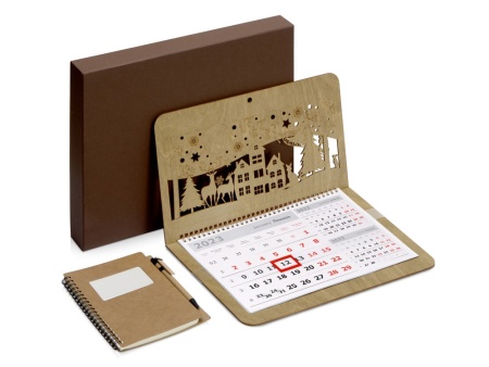 Набор поставляется в коробке шоколадно-коричневого цвета, внутри которой вы найдете календарь с фанерной крышкой на 2023 и блокнот на кольцах в картонной обложке, дополненный ручкой.