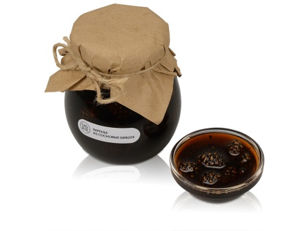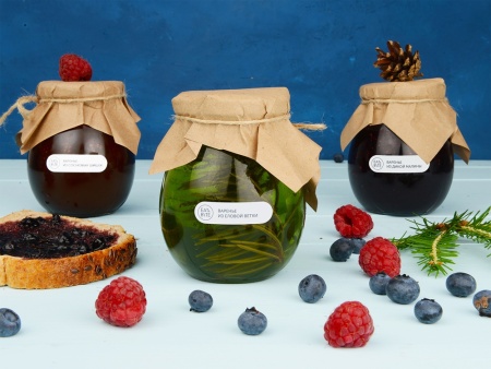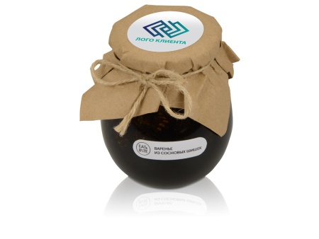 Банка варенья обернута крафт-бумагой, на которую возможно сделать нанесение корпоративного логотипа.