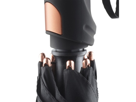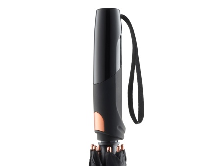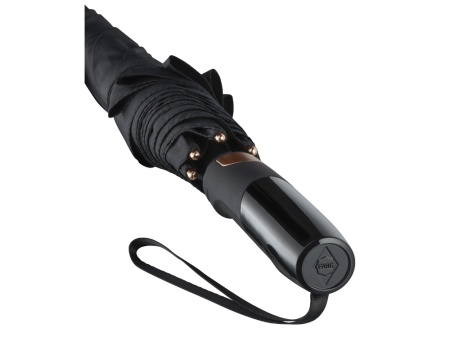 Зонт-трость с большим куполом укроет от дождя двух человек. Каркас изготовлен из особо прочного алюминия. Детали из алюминия окрашены в популярные цвета и стильно выглядят. Зонт плавно раскрывается нажатием кнопки на ручке. В ручку интегрирован эластичный шнур для большего удобства.