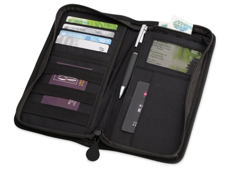 Портмоне для путешествий из прочного полиэстера сделает любую поездку более комфортной. Здесь предусмотрено место для паспорта, билетов и денег, кармашки для пластиковых карт, удобный держатель для ручки и фиксаторы на резинках для карточек или документов. Портмоне закрывается на молнию, а на его внешней стороне предусмотрен дополнительный карман для посадочного талона или других документов, которые приходится все время доставать. Портмоне Вест – прекрасный подарок для тех, кто любит путешествовать и проводит много времени в разъездах.