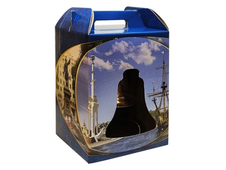 Колокол сувенирный весом 1кг Царский на дубовой подставке. Поверхность колокола матированная с вызолочением.