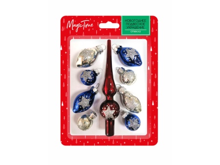 Елочный набор из коллекции Magic Time - классический вариант для украшения вашей новогодней ели. Елочные игрушки насыщенных цветов из стекла будут идеально сочетаться с зелеными хвойными ветвями. В наборе игрушек присутствует верхушка для елки, которая дарит приятное ощущение уютного и доброго праздника. Такой набор можно использовать как дополнение к композиции, так и как основной элемент ели. Также он послужит идеальным подарком для ваших близких и родных. Каждый набор упакован в индивидуальный блистер.