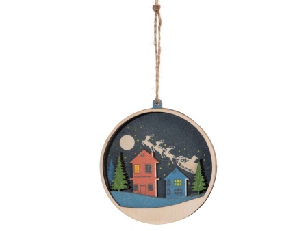 Новогодняя игрушка выполнена из трех слоев фанеры, домики, небо и елочки, изображенные на ней, расположены на разных уровнях, что позволяет создать выпуклый рельеф. Весь зимний пейзаж выглядит объемно, создавая праздничное настроение.