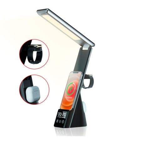 Настольная лампа Zeus имеет три режима настройки света (яркий, теплый, холодный), её можно использовать как в вечернее время, так и в качестве ночного освещения. С помощью настольной лампы Вы можете одновременно заряжать мобильный телефон, беспроводные наушники (AirPods) и часы (iWatch), и другие гаджеты, поддерживающие беспроводную зарядку. В лампе встроены часы и будильник. Отлично подойдет для письменного стола, в офис, гостиную и спальную комнату. Размер в упаковке: 27*10,5*6,5 см