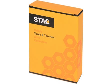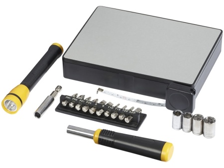 Набор инструментов от Stac включает 18 предметов. В набор входит 1 светодиодный фонарик, измерительная лента длиной 1 м, отвертка с магнитным удлинителем, 1 торцевой гаечный ключ и 4 головки гаечных торцевых ключей (7/8/9/10), набор из 9 бит для шуруповерта (PH, PZ, плоский и Torx). Коробка закрывается на магнитную крышку.
