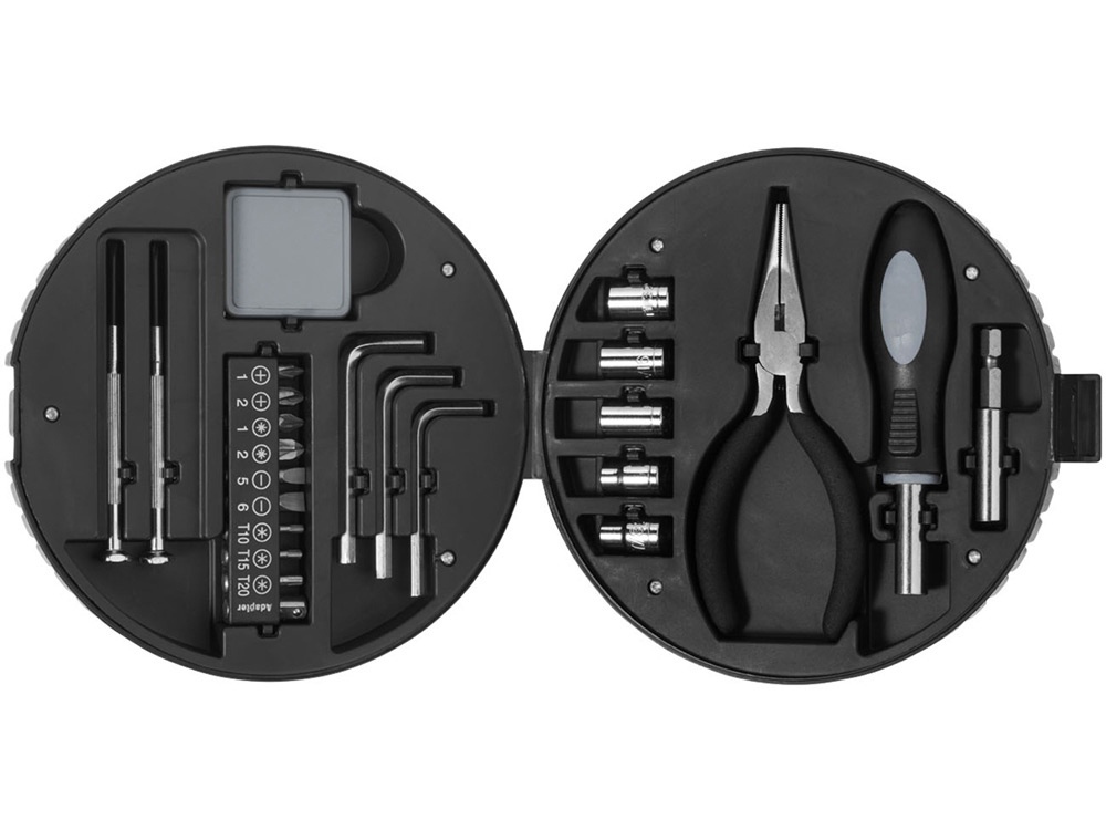 Набор из 25 инструментов включает измерительную мини рулетку, крестообразную отвертку, плоскую отвертку, 9 насадок с адаптером (4 крестообразных шлицев, 2 плоских шлица и 3 шестигранных шлица), 3 шестигранных ключа, 5 головок (5-9 мм), острогубцы, рукоятку отвертки, адаптер для насадок и удобный футляр.
