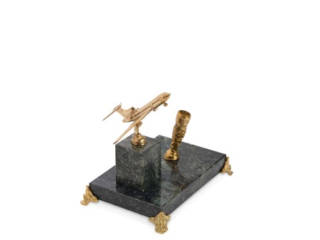 Настольный прибор с небольшой статуэткой в форме самолета станет превосходным подарком для руководителей туристических фирм и аэрокомпаний. На приборе предусмотрен держатель для ручки. Прибор выполнен из натурального змеевика и латуни с бронзовым покрытием.