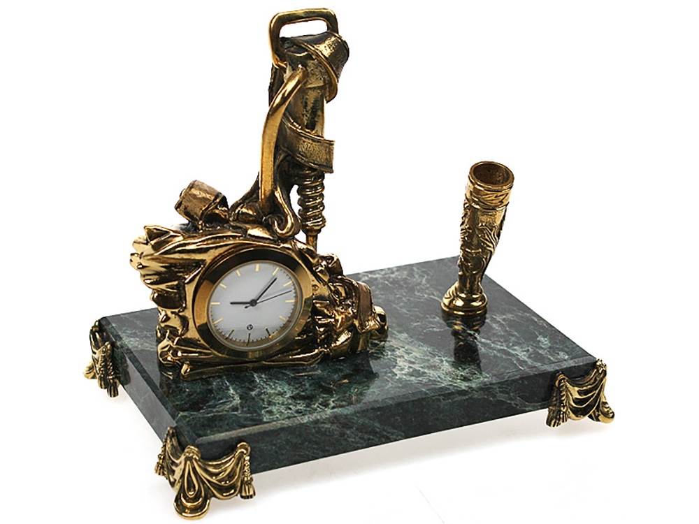 Оригинальный тематический подарок для руководителей и ключевых партнеров ресурсодобывающих предприятий. Настольный прибор Шахтерский оснащен держателем для ручки и небольшими часами. Прибор выполнен из натурального- змеевик и латуни с бронзовым покрытием.
