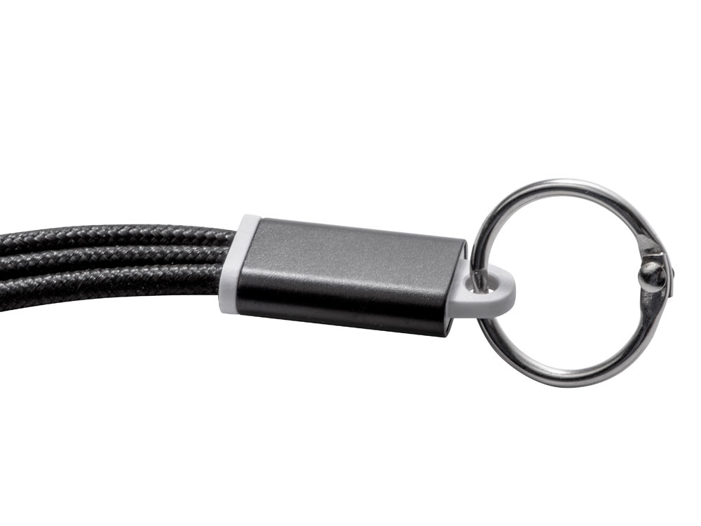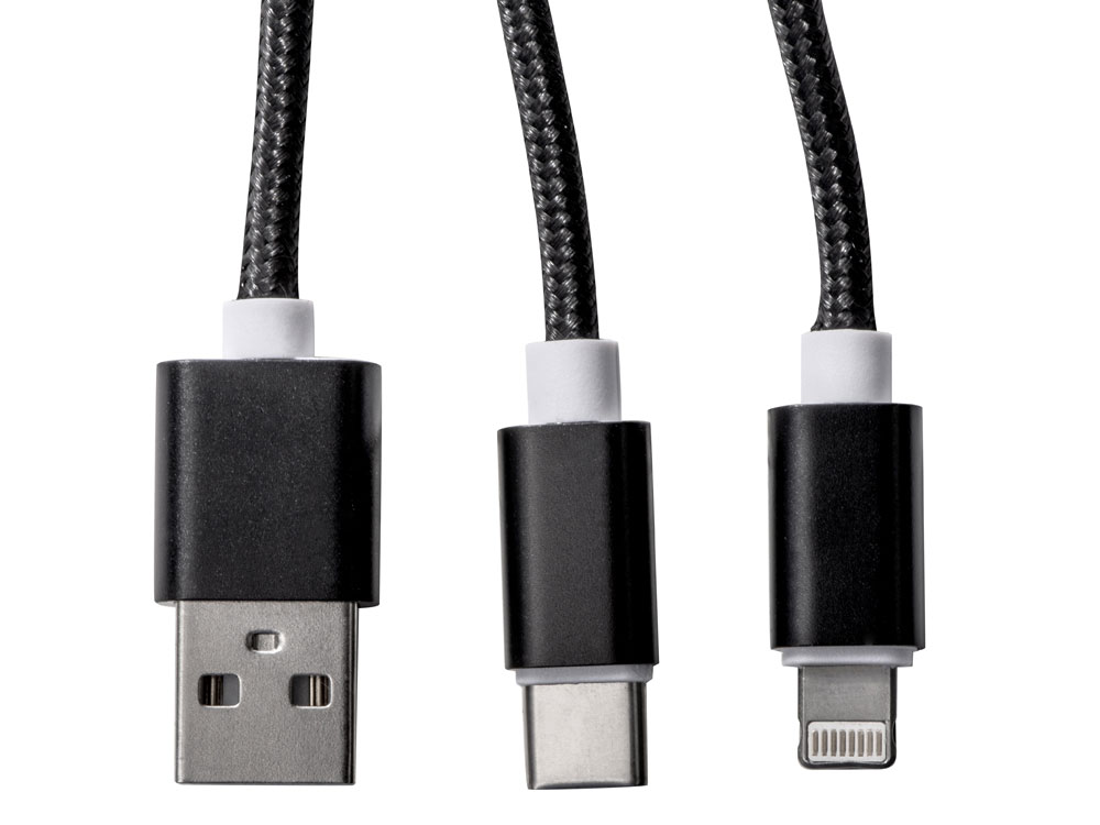 Кабель для зарядки Tres 3-в-1 с брелоком, коннекторами 1 type с, 1 USB type A и двойным совместимым коннектором 2-в-1 для устройств с ОС Apple® iOS и Android. В комплект входит брелок. Для зарядки устройств Apple подключайте кабель стороной без контактов; для зарядки устройств с ОС Android подключайте кабель стороной с контактами. Алюминий.