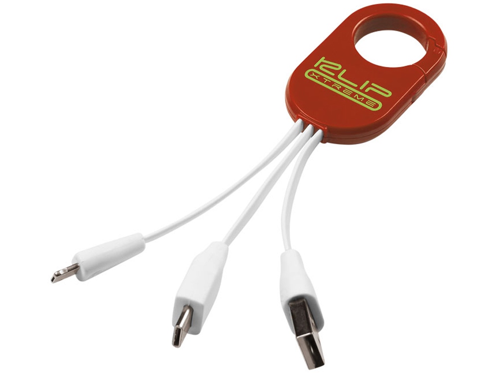Кабель для зарядки 3-в-1. Кабель для зарядки Troop 3-в-1 с коннектором USB Type C и двойным совместимым коннектором 2-в-1 для устройств Apple® iOS и Android. Кабель оснащен карабином для удобного крепления к сумке. АБС-пластик.