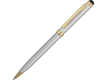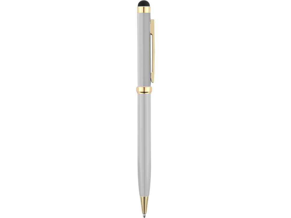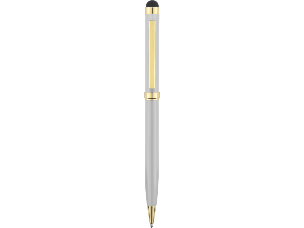 Стильная металлическая ручка со стилусом Голд Сойер – по-настоящему универсальный пишущий инструмент. Ею можно делать записи на бумаге, а перевернув, работать с емкостными экранами с помощью стилуса. Элегантность ручки подчеркивают позолоченные детали: клип, носик и кольцо.