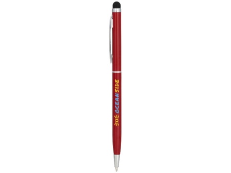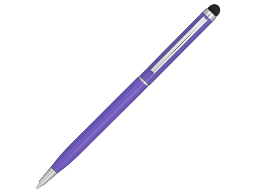 Алюминиевая шариковая ручка Joyce. Тонкая алюминиевая шариковая ручка с поворотным механизмом и стилусом. Алюминиевый корпус с металлическим зажимом и кольцом посередине, остальные элементы из пластика.