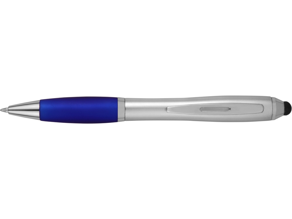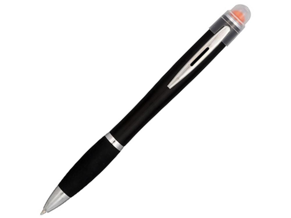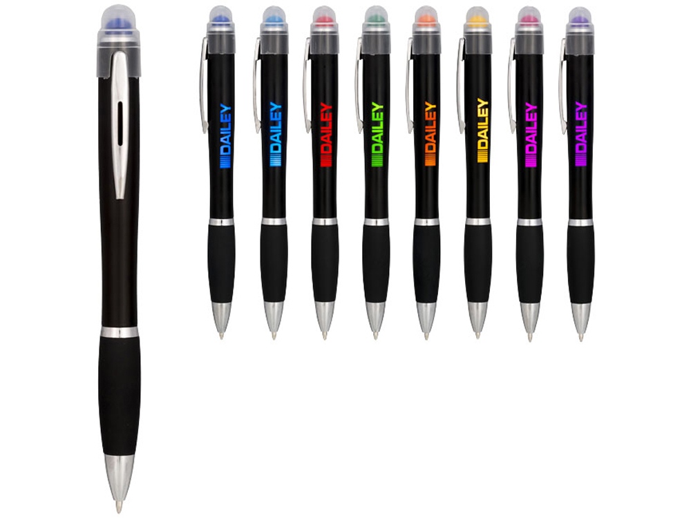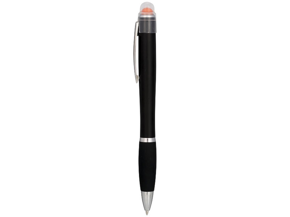 Nash - черная шариковая ручка со стилусом. При нажатии стилуса логотип подсвечивается в цвет стилуса. Включены 3 батареи LR41. ABS& AS plastic.