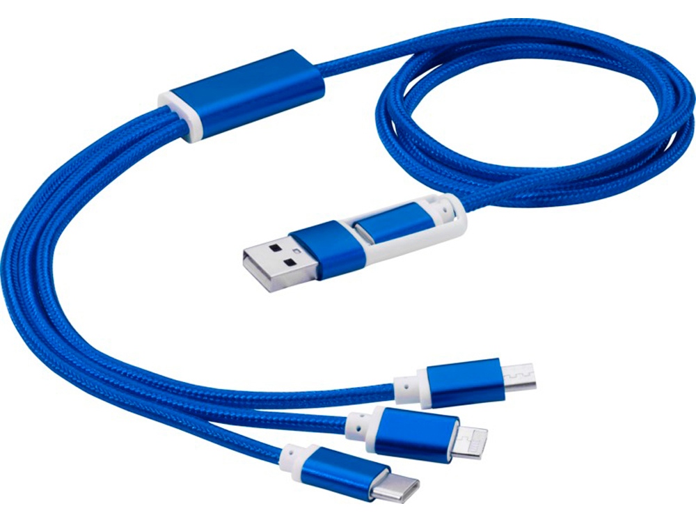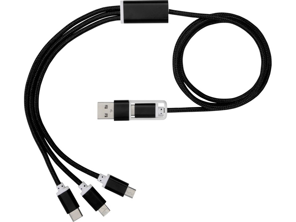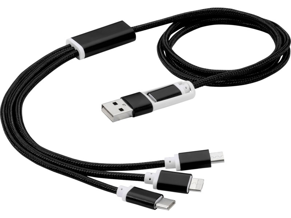 Зарядной кабель с нейлоновой оплеткой с 5 различными разъемами: Вход Type-C, вход USB-A, выход Type-C, выход Apple® iOS и выход micro USB. Это позволяет использовать кабель также с устройствами с выводом Type-C, которым оснощены телефоны и компьютеры MacBook нового поколения. Длина кабеля — 100 см. Выходной разъем 2-в-1 до 2 А. Выход Type-C с силой тока до 3 А.