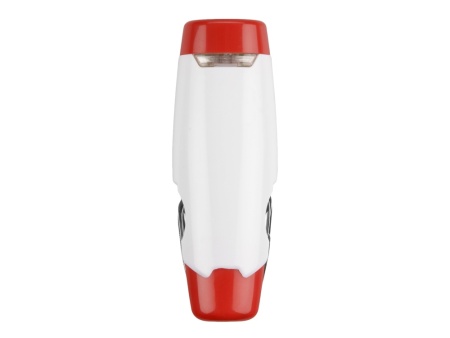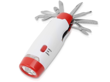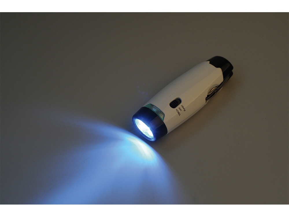 Замечательный фонарик-мультиинструмент дает яркий световой поток синего и красного цветов. Фонарик станет прекрасным и незаменимым помощником во время похода.