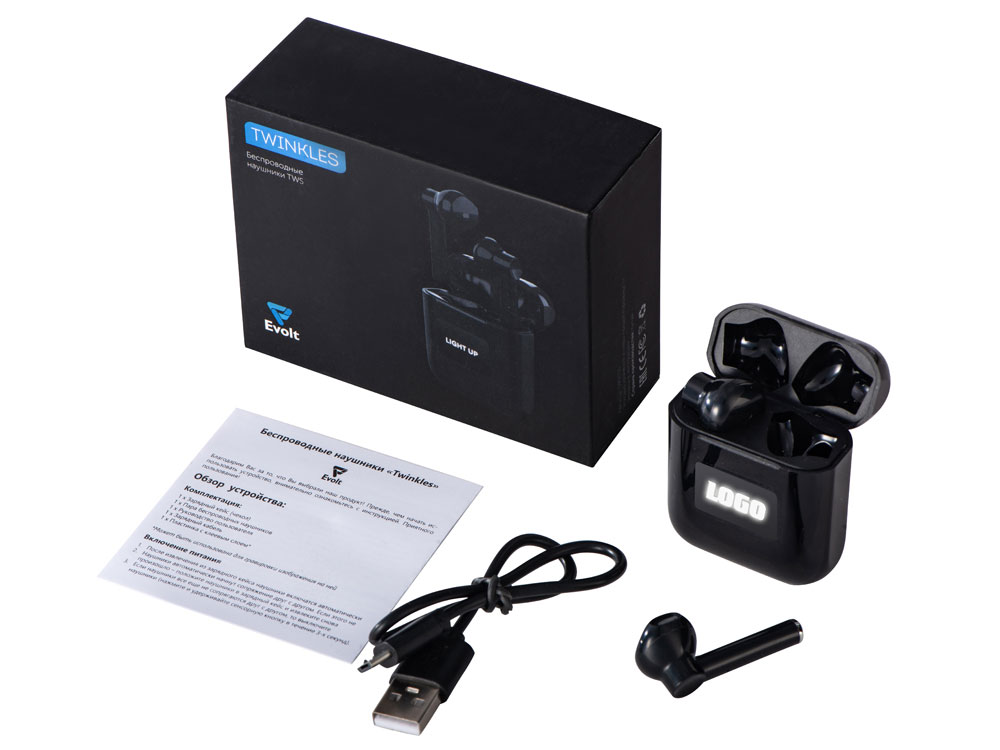 Беспроводные наушники Twinkles от Evolt — почти готовый мерч, который лишь ждет, когда вы забрендируете его: при гравировке на зарядном кейсе ваше лого будет подсвечиваться!