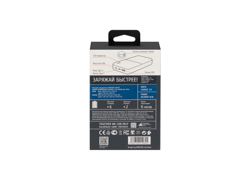 Литий-полимерный внешний аккумулятор емкостью 20000 мАч с поддержкой QC 3.0 и PD. Поддержка режима быстрой зарядки Quick Charge (QC 3.0) и Power Delivery (PD). Поддержка режимов быстрой зарядки Huawei FCP и Samsung AFC. Защита от перегрузок, короткого замыкания, чрезмерного заряда и разряда. Автоматическое включение/выключение. LED индикатор показывает уровень заряда (заряжен/в процессе заряда/разряжен). Кабель USB - Type-C, поддерживающий режим Quick Charge, в комплекте. Емкости достаточно для 6 зарядок обычного смартфона или до 3 зарядок обычного планшета. Кабель USB - Type-C, поддерживающий режим Quick Charge, в комплекте. Функция сквозного заряда: Можно одновременно заряжать внешний аккумулятор и подключенное к нему устройство.