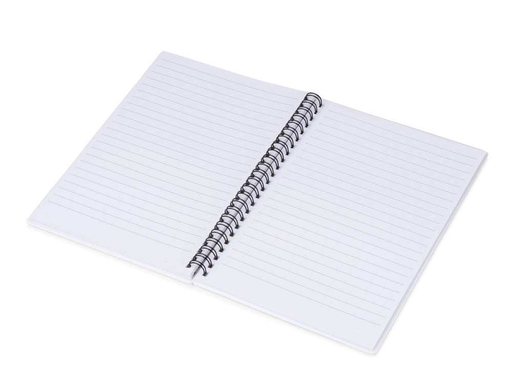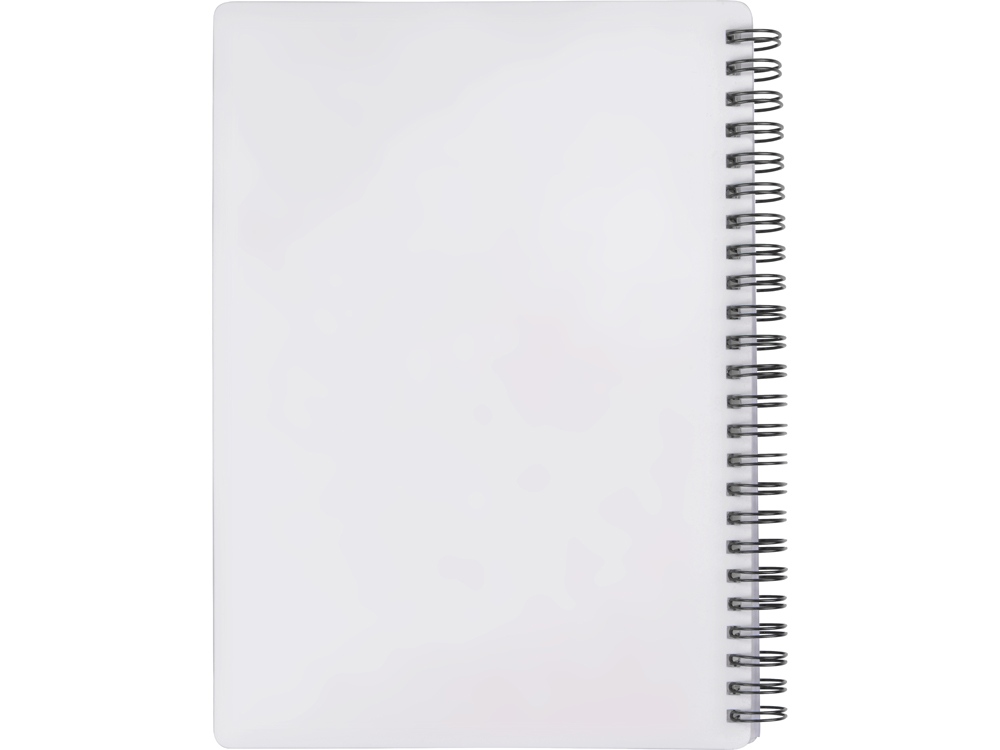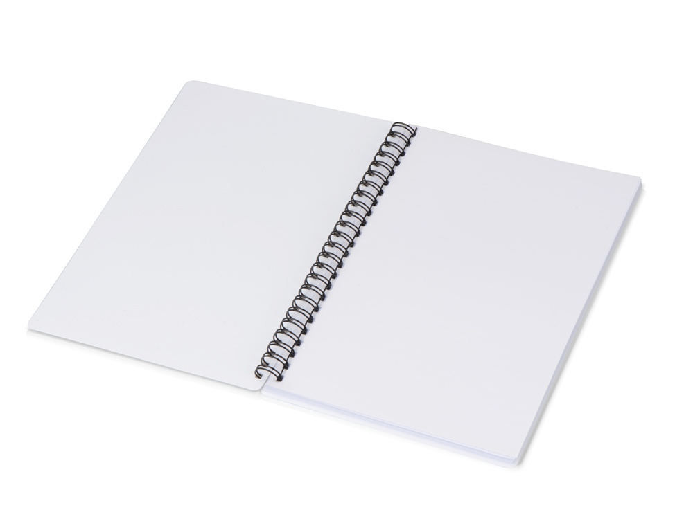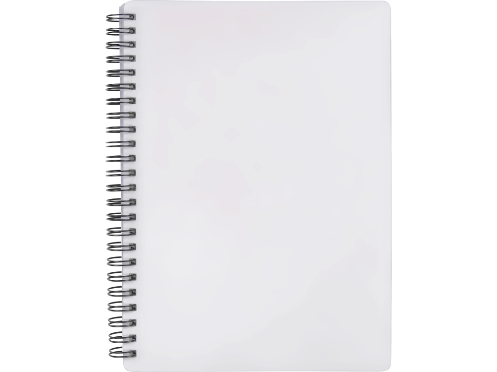 Блокнот в белой пластиковой обложке отлично подойдет для нанесения логотипа. Удобное крепление на спирали.
